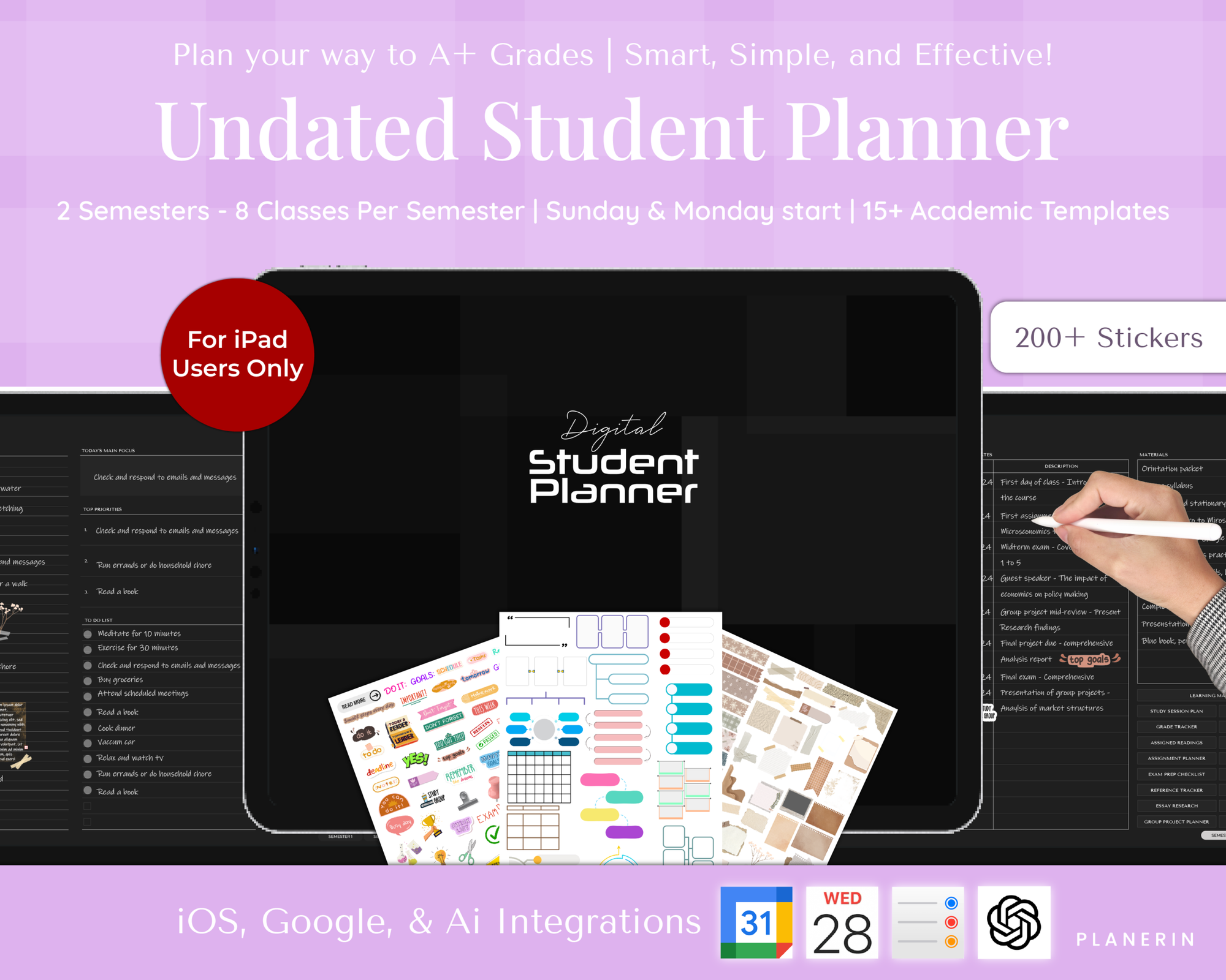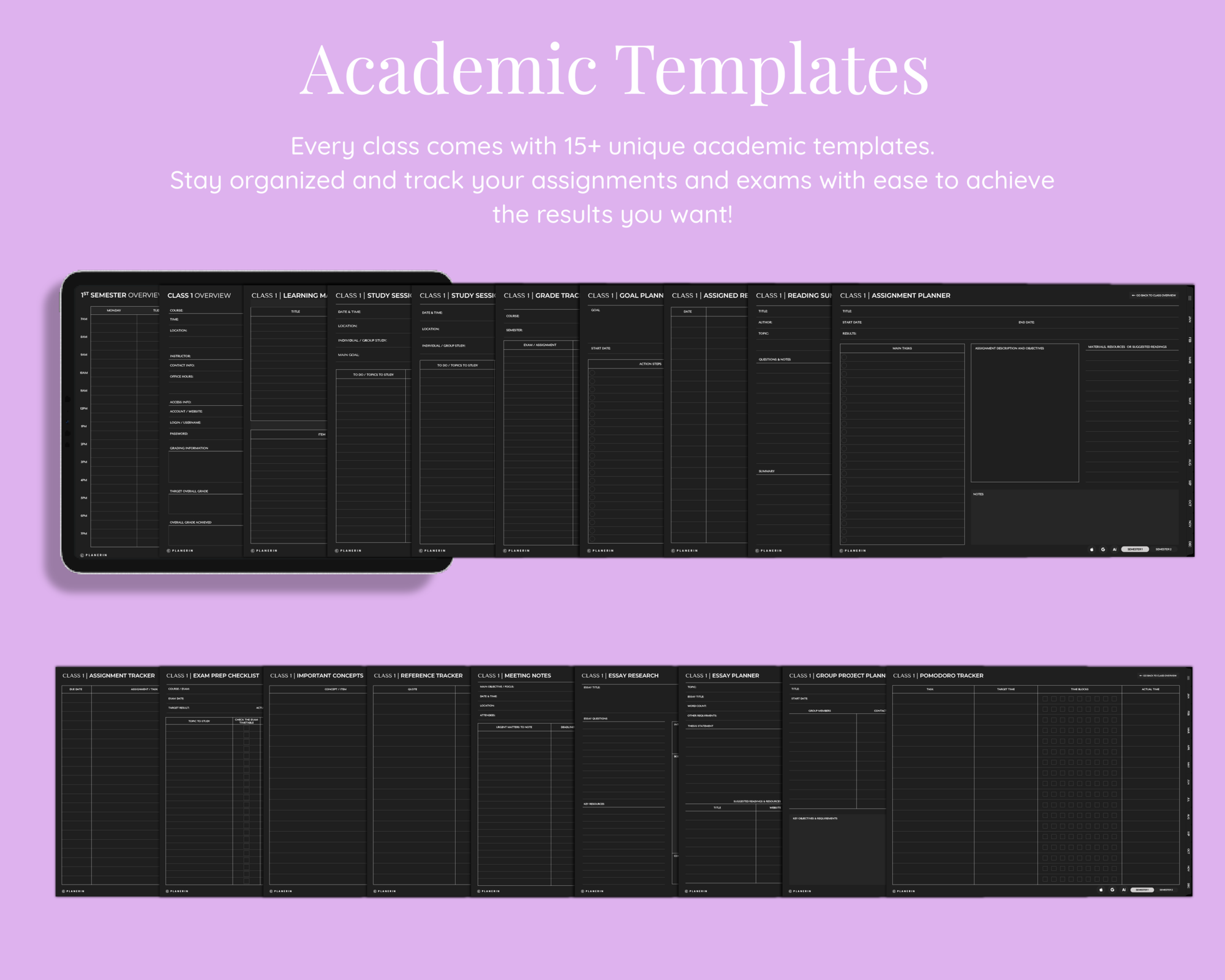 15+ Academic Planning Templates: This planner includes a complete set of academic templates designed specifically for student needs, including semester overview, class overview, learning materials, study session planner, session log, grade tracker, goal planner, assignment planner, exam preparation checklist, important concepts, reference tracker, meeting notes, essay planner, essay research pages, group project planner, and a Pomodoro tracker.