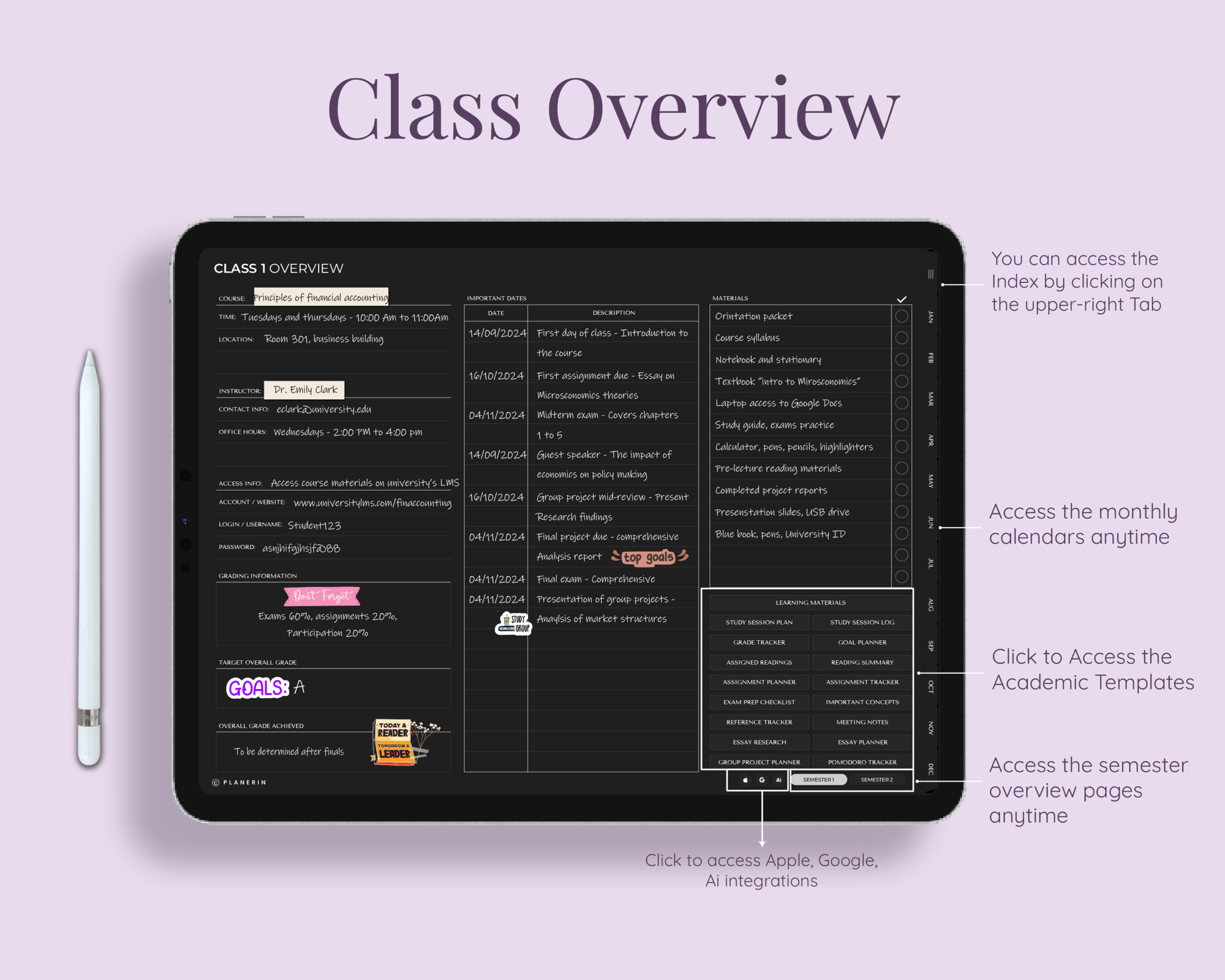 Two Semesters with Eight Classes Each: This digital academic planner includes two full semesters, each with space for up to eight classes, making it easy to organize coursework, schedules, and materials in one place.