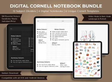 This digital Cornell notebook bundle has everything you require to prepare effective notes. It has 4 notebooks (2 landscape and 2 portrait) in white and dark modes. There are 8 unique Cornell templates in each notebook and 12 subject dividers. Additionally, it has 235+ essential digital stickers that will make your notes look better.
