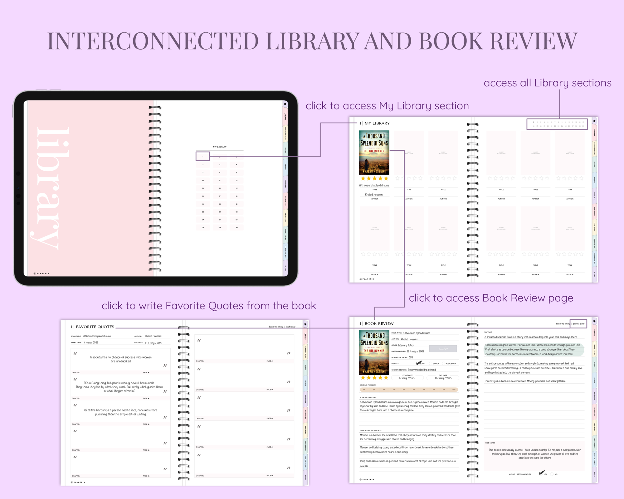 Created for readers who value simplicity, She Reads, She Feels – Digital Reading Journal offers a beautifully organized digital space to track and review books and series, preserve your favorite quotes, indulge into reading challenges, and a lot more. Thoughtful linking throughout the journal makes every section easy to access and a pleasure to use.
